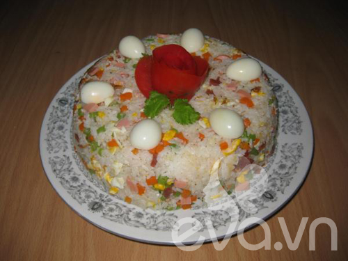 Khi hạt cơm hơi săn lại, cho vào khuôn nén lại, rồi úp ra dĩa. Trang trí bông hồng.